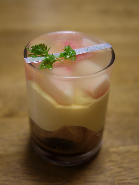 ルシュクルというケーキ屋さんの桃とわらび餅のグラスデザート 420円です。