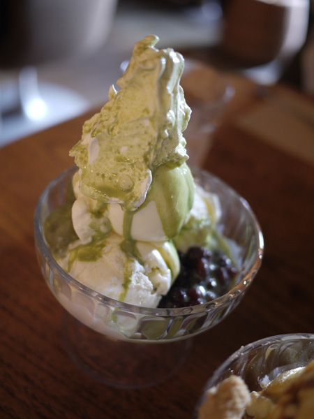 白玉と小豆に抹茶のソース、アイスの下にはパイ。