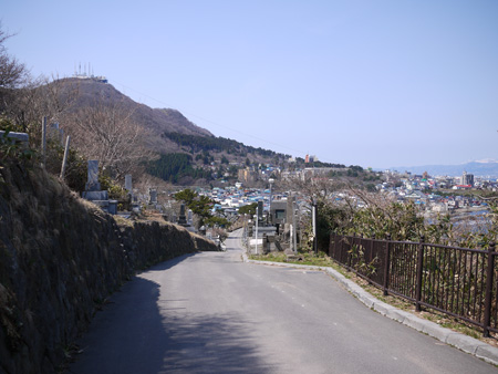 上ってきた坂を振り返ると・・・ああ、駅があんなに遠くに・・・。
