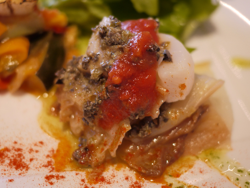 黒オリーブ・アンチョビ・ケッパーのソースがかかってます。
