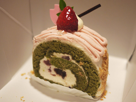 抹茶のスポンジ生地に桜のクリーム!