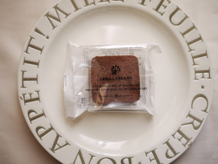 4.5×4.5センチの、チョコをココアクッキーで挟んだお菓子です。