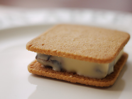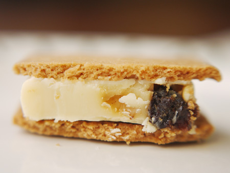 間に挟まったラムレーズン入りのホワイトチョコは甘さがくどくなくて、