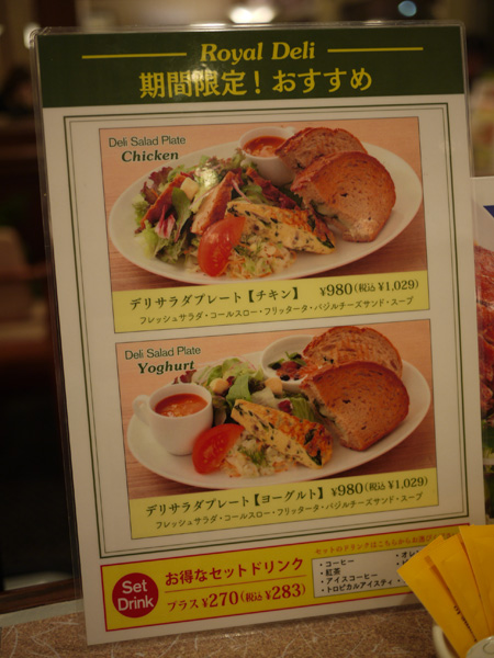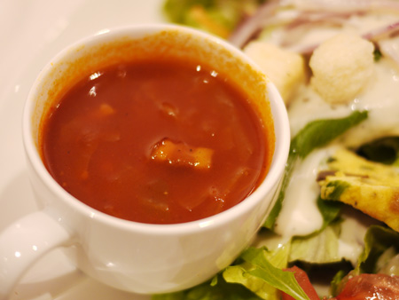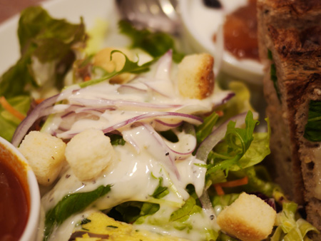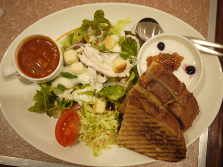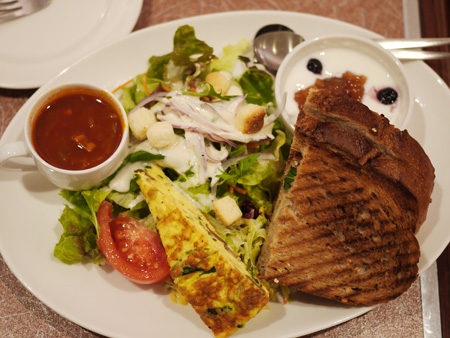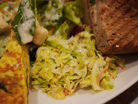 フレッシュサラダ、コールスロー、フリッタータ、バジルチーズサンド、スープのセットです。