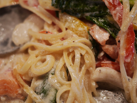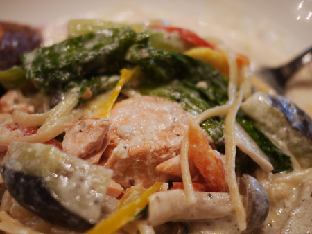 本日のパスタは、サーモンと地野菜のシークワーサークリーム。