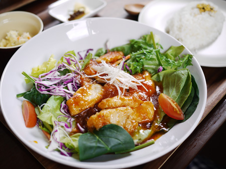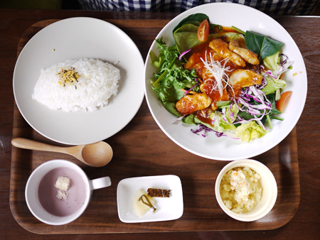 こちらは「チキンのトマト照り焼きソースサラダ仕立てカップスープとライス付」