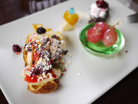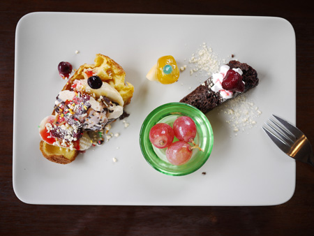 ポップオーバーのバナナチョコアイス、ぶどう、金柑とりんご、ガトーショコラの豪華4?点盛り!