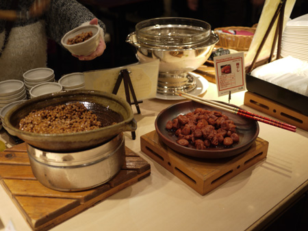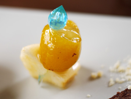 りんごの上に乗ってる金柑はシロップで煮たやつですかね。