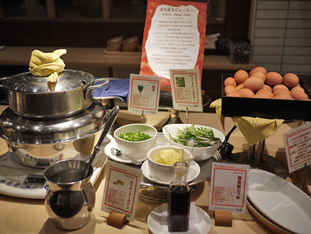 ぼろぼろジューシー、トッピング用のねぎ、フーチーバー(よもぎ)、温泉卵。