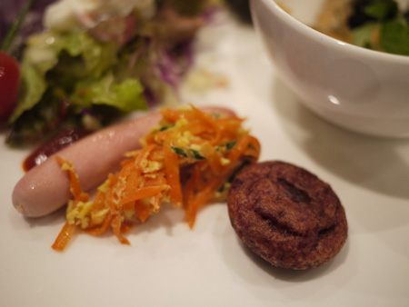 目玉焼きorスクランブルエッグ、温野菜のココット、自家製ソーセージパティ、