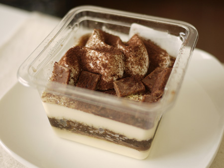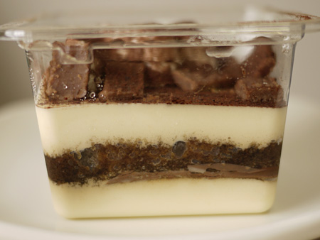 その下はコーヒーシロップ漬のスポンジ、薄い板チョコ、マスカルポーネムースの層になってます。