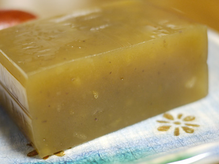 蓋を取ると、薄いピンクの羊羹が表面に。