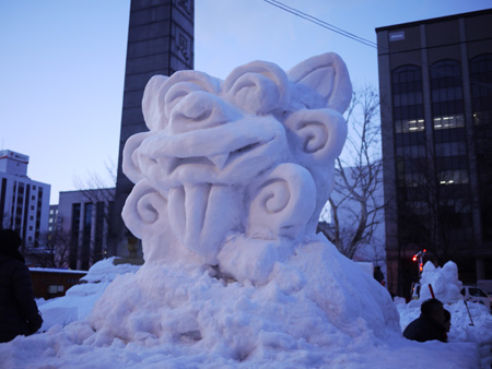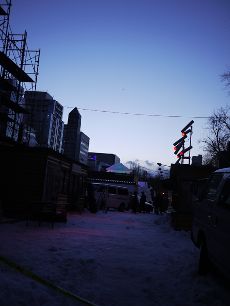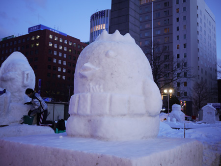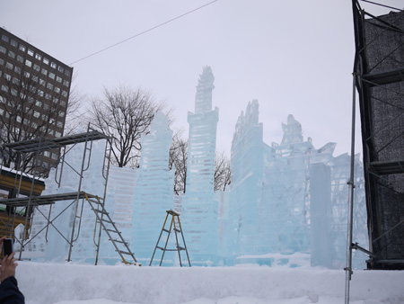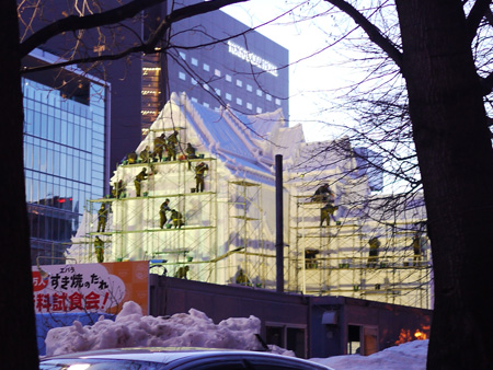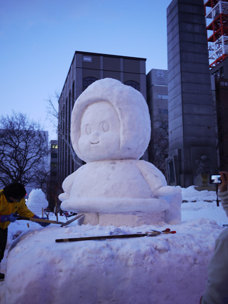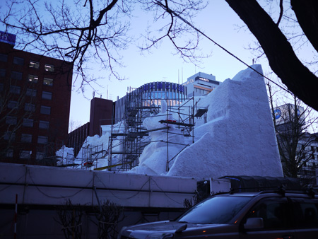 日も暮れる中でっかい雪像を頑張って作ってますねー。
