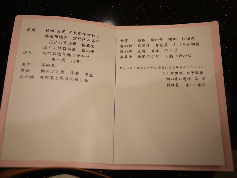 食事テーブルにはお品書きが置いてあったのですが、表紙がちゃんとあって、いい気遣いですね~。